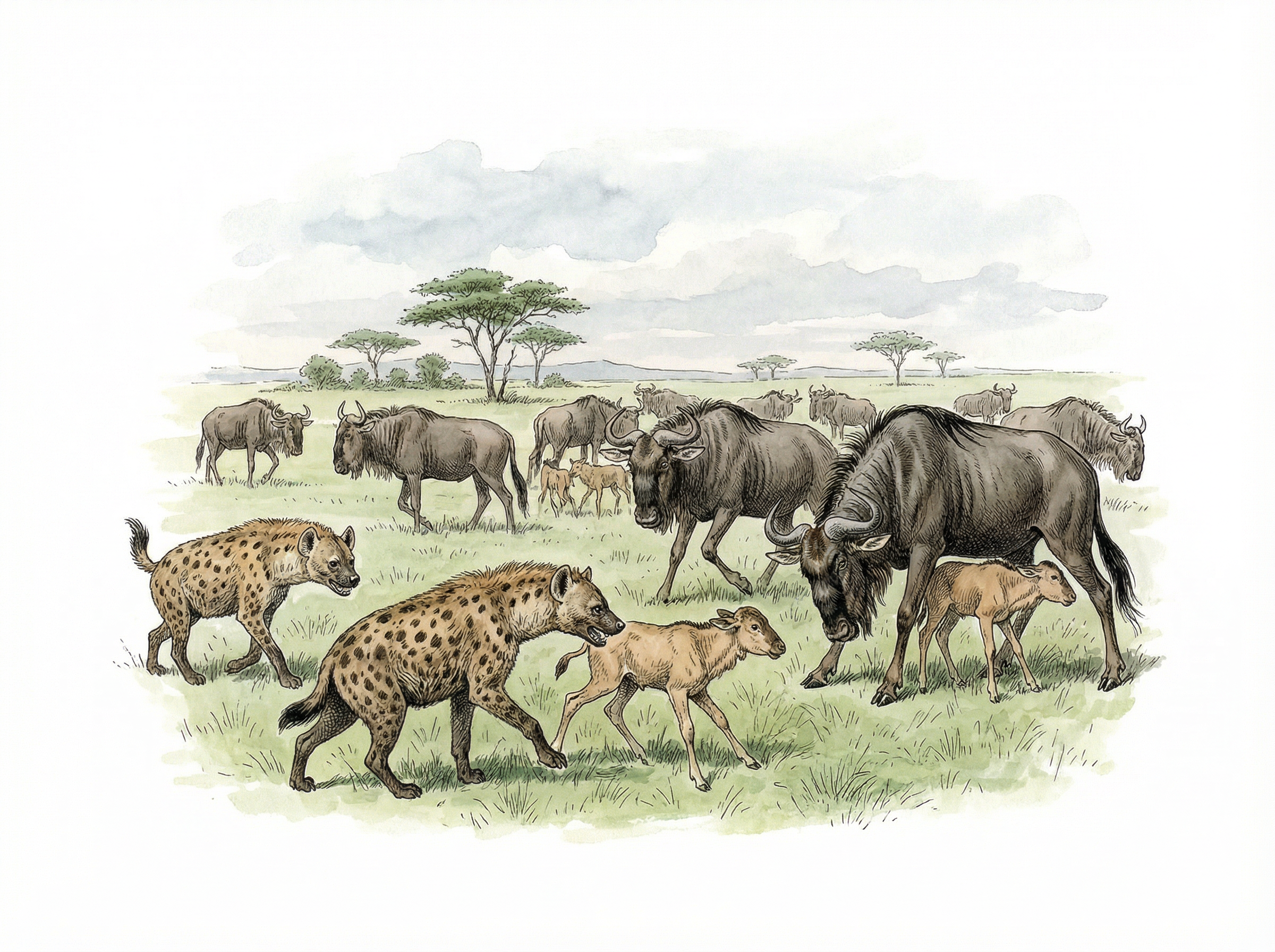 這種「集中產子」是進化而來的生存策略。大量小牛羚同時出生,讓獅子、鬣狗和花豹等肉食動物「供過於求」,大幅提高了單一小牛羚的存活率。新生的小牛羚必須在 幾分鐘內 站起並跟上群體,否則就會成為肉食動物的餐點。