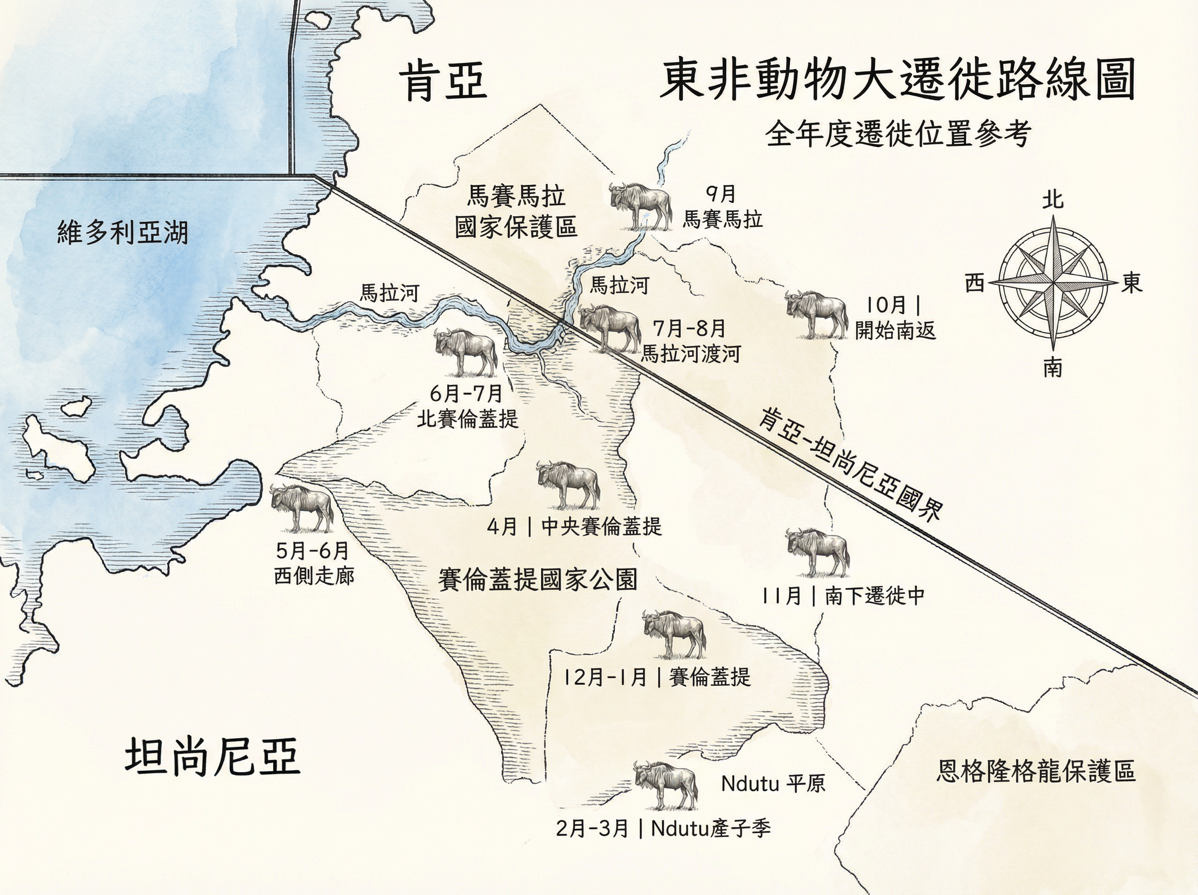 東非動物大遷徙發生在坦尚尼亞的賽倫蓋提國家公園 (Serengeti National Park) 與肯亞的馬賽馬拉國家保護區 (Maasai Mara National Reserve) 之間。這不是一次性的位移,而是全年無停止的環形遷徙。