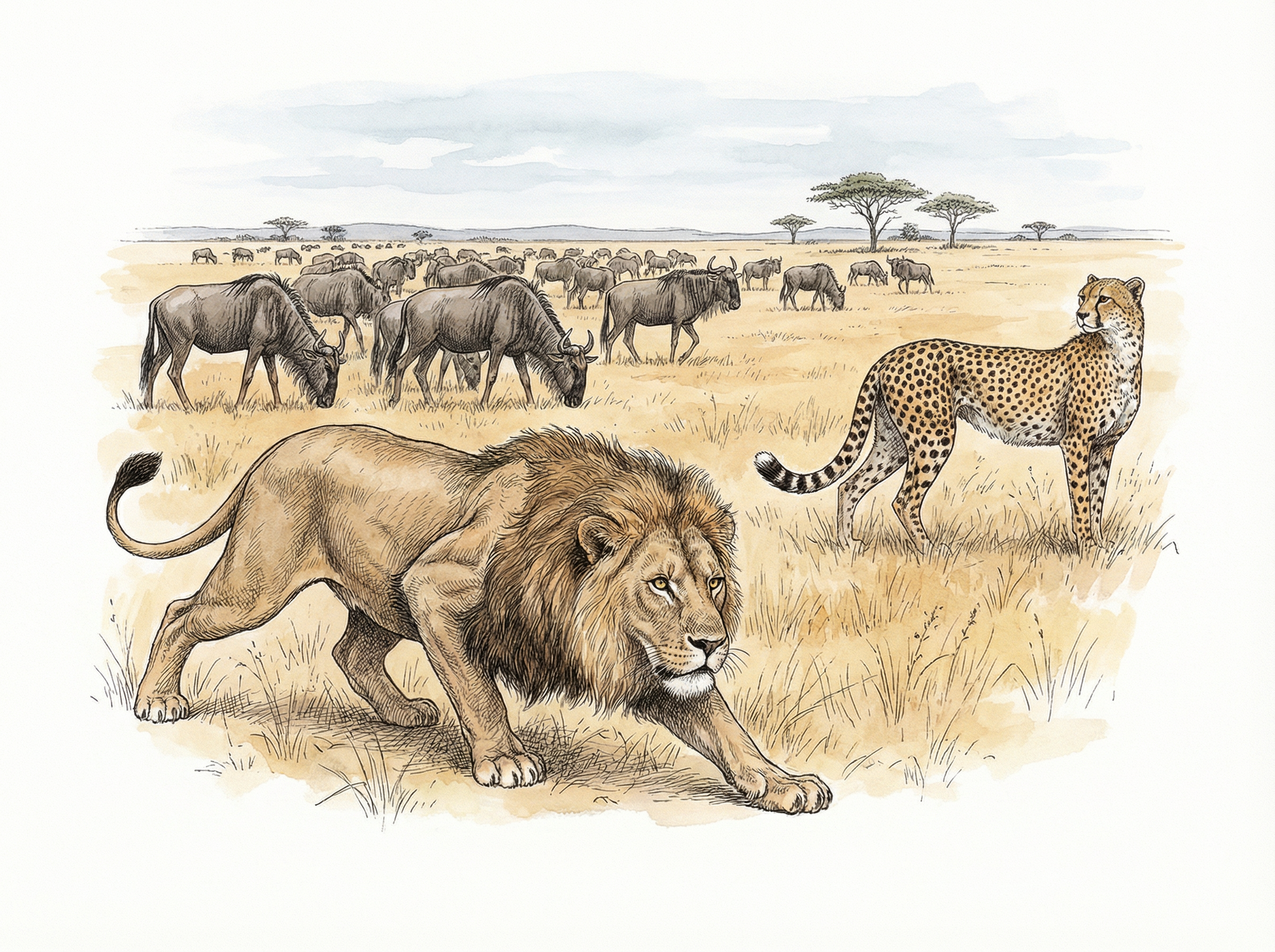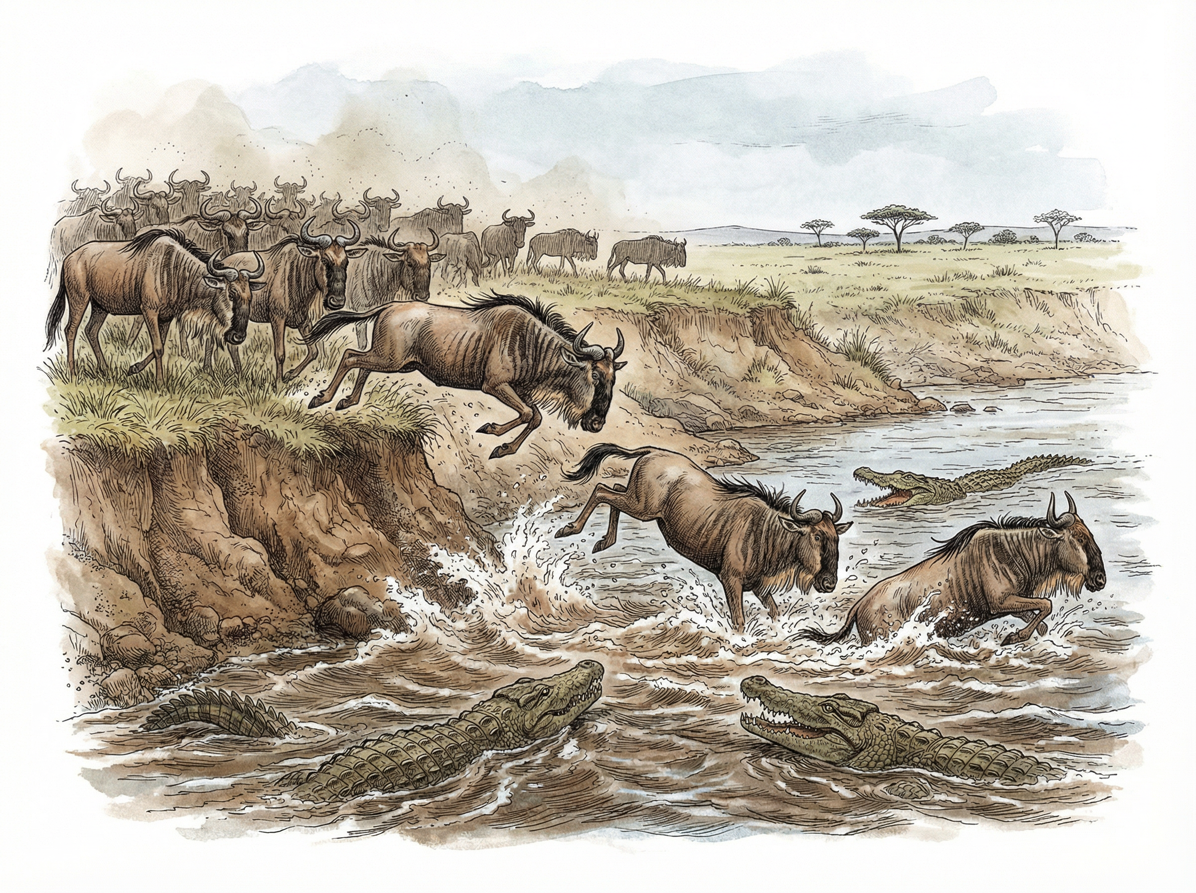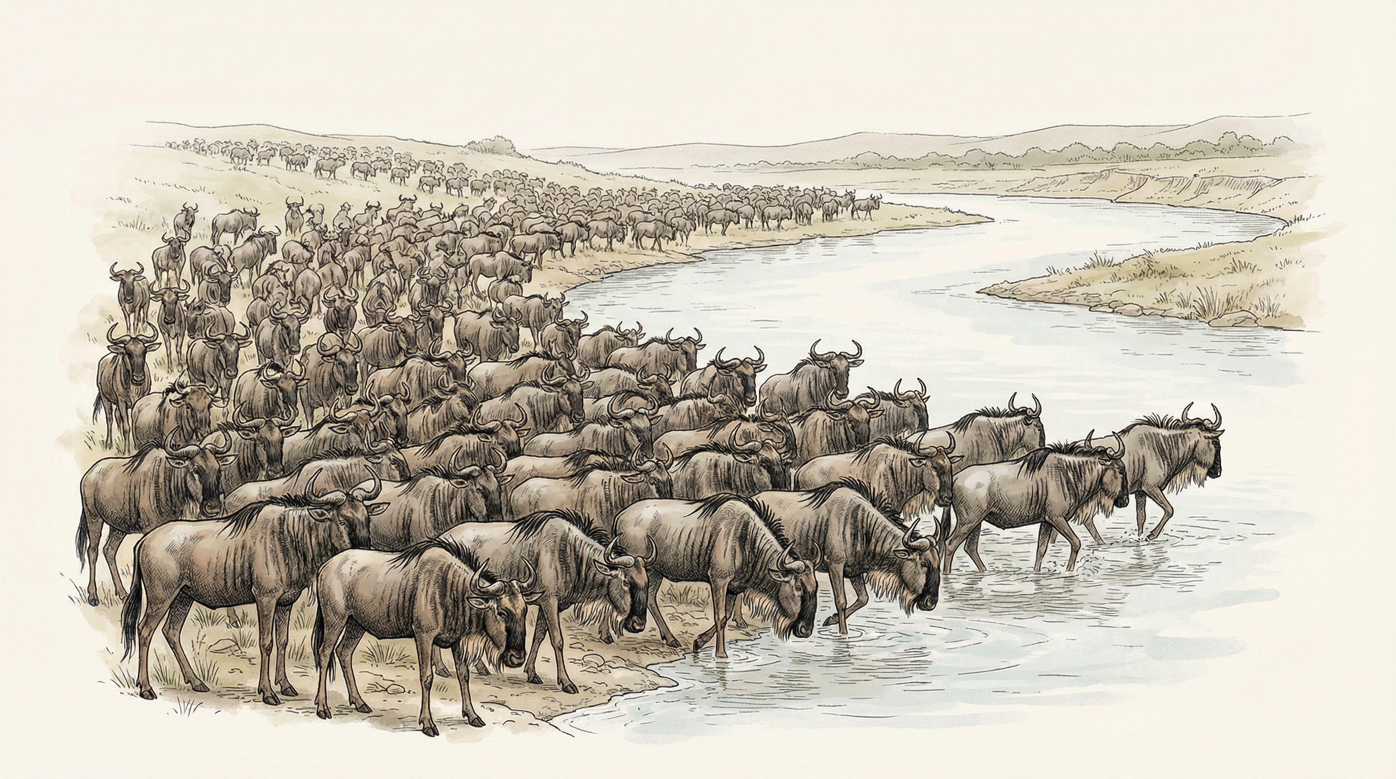 研究顯示,牛羚擁有驚人的感知能力:牠們能在 50 公里外 偵測到降雨的氣息,從而提前調整移動方向。這種本能引領著群體在賽倫蓋提與馬賽馬拉之間畫出一個巨大的環狀路線。