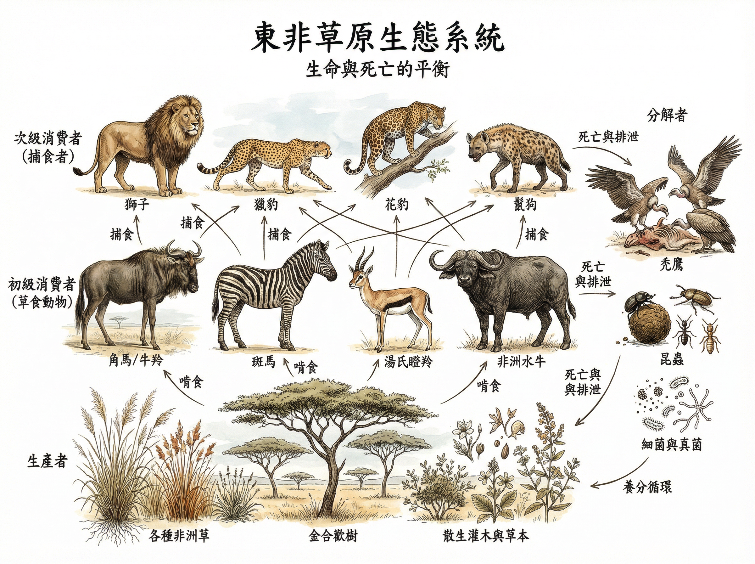 這種移動不僅是動物的生存行為,也形塑了整個生態系統。牛羚排泄的糞便與尿液像「移動的肥料」,持續滋養著草原。牠們不斷吃草也防止了灌木生長,保持草原開闊。每年約有 25 萬頭牛羚和 3 萬頭斑馬在旅程中死亡,牠們的屍體養活了鱷魚、鬣狗、禿鷹、食腐類動物…..等無數生命。
